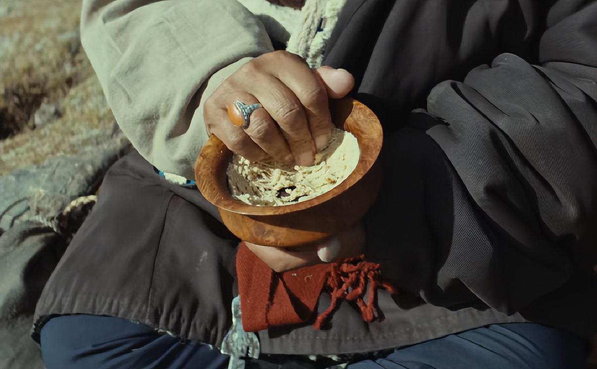 可能对于观众来说,有点无法接受这样的方式,但其实他们吃的是传统藏族食物“糌粑”,由青稞炒熟后磨成粉制成,食用时拌入酥油茶揉捏成团。