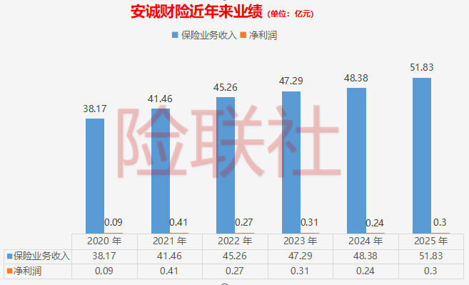 从过往业绩来看,安诚财险虽然2020年就开启了盈利模式,但赚钱能力一直“原地踏步”。2020到2024这五年,公司保险业务收入从38.17亿元慢慢涨到48.38亿元,营收逐年递增,净利润却始终在低位徘徊:2020年赚0.09亿元,2021年稍涨至0.41亿元,之后又回落至0.27亿元、0.31亿元,2024年只剩0.24亿元。