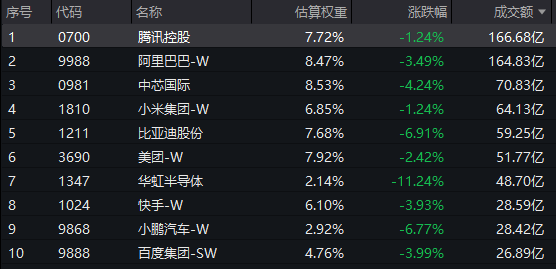 港股科技热门股多数收绿:华虹半导体跌超11%,比亚迪股份跌超6%,中芯国际跌超4%,阿里巴巴-W、快手-W跌超3%,美团-W跌超2%,腾讯控股、小米集团-W跌超1%。
