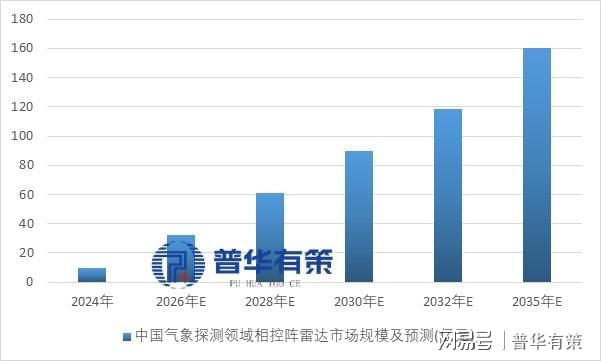 未来,相控阵雷达在天气领域的需求将集中在三个方面:局部区域的补盲建设、新一代气象雷达网的升级迭代,以及人工影响天气作业的市场需求。各省市正在推进X波段雷达补盲建设,随着雷达更新进程和渗透率提高,市场需求将持续增长。预计到2035年,天气领域相控阵雷达市场规模将达到160.41亿元。