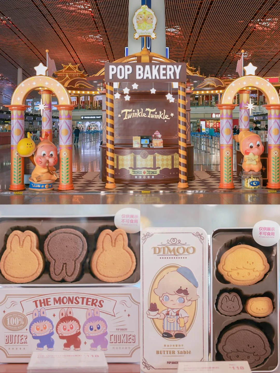 这家机场快闪店,直接把“可食用IP”的概念拉满,店内共有9款造型精致的甜品,除了星星人双棒雪糕、SKULLPANDA冰淇淋,还有DIMOO与LABUBU造型的黄油曲奇礼盒,每一款都适合携带。