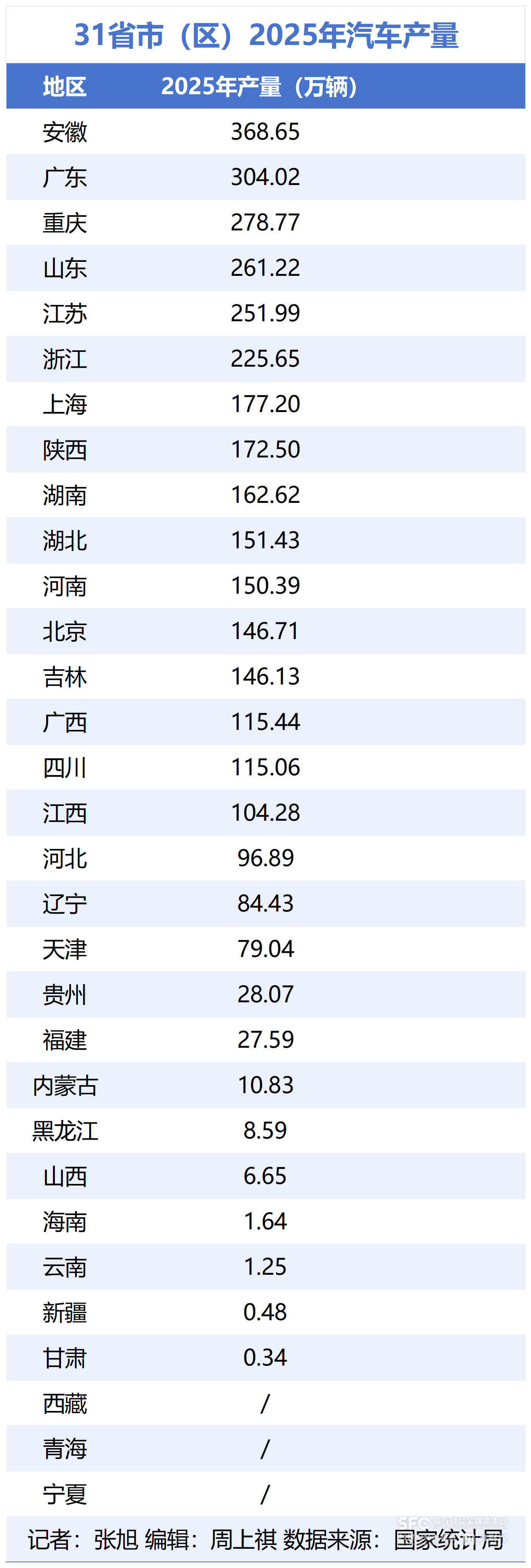 国家统计局数据库显示,2025年,汽车产量前十省份分别是安徽、广东、重庆、山东、江苏、浙江、上海、陕西、湖南和湖北,产量分别是368.65万、304.02万、278.77万、261.22万、251.99万、225.65万、177.2万、172.5万、162.62万和151.43万。