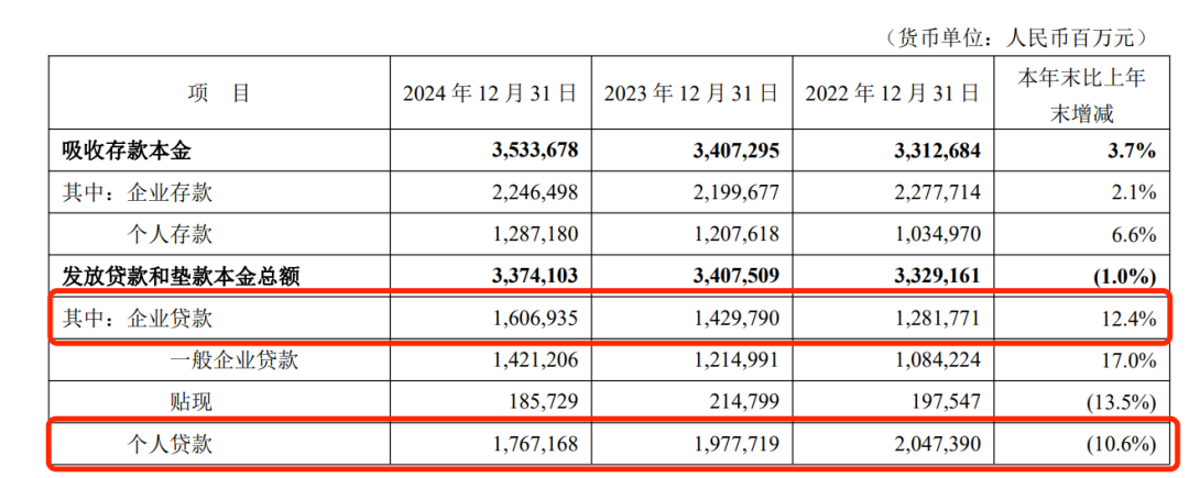 利息净收入的锐减,主要源于平安银行信贷结构的变动。财报显示,平安银行2023-2024年大力压降收益率更高的个人贷款,转而增加收益率更低的企业贷款的比例。这一趋势在2025年前三季度仍在持续,截至2025年9月30日,企业贷款占比从2022年底的38.5%上升至49.4%,几乎追上了个人贷款的占比(50.6%)。