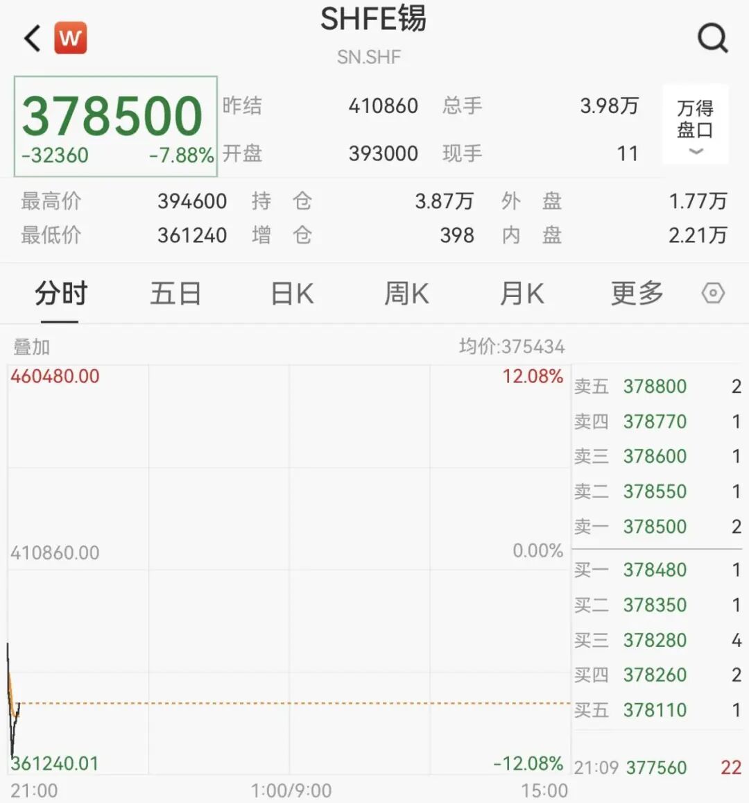 上期所沪锡期货主力合约一度跌超12%,随后拉升,最新报378500元/吨。