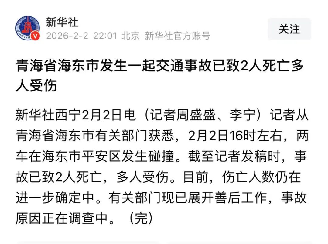 新华社西宁2月2日电(记者周盛盛、李宁)记者从青海省海东市有关部门获悉,2月2日16时左右,两车在海东市平安区发生碰撞。截至记者发稿时,事故已致2人死亡,多人受伤。目前,伤亡人数仍在进一步确定中。有关部门现已展开善后工作,事故原因正在调查中。