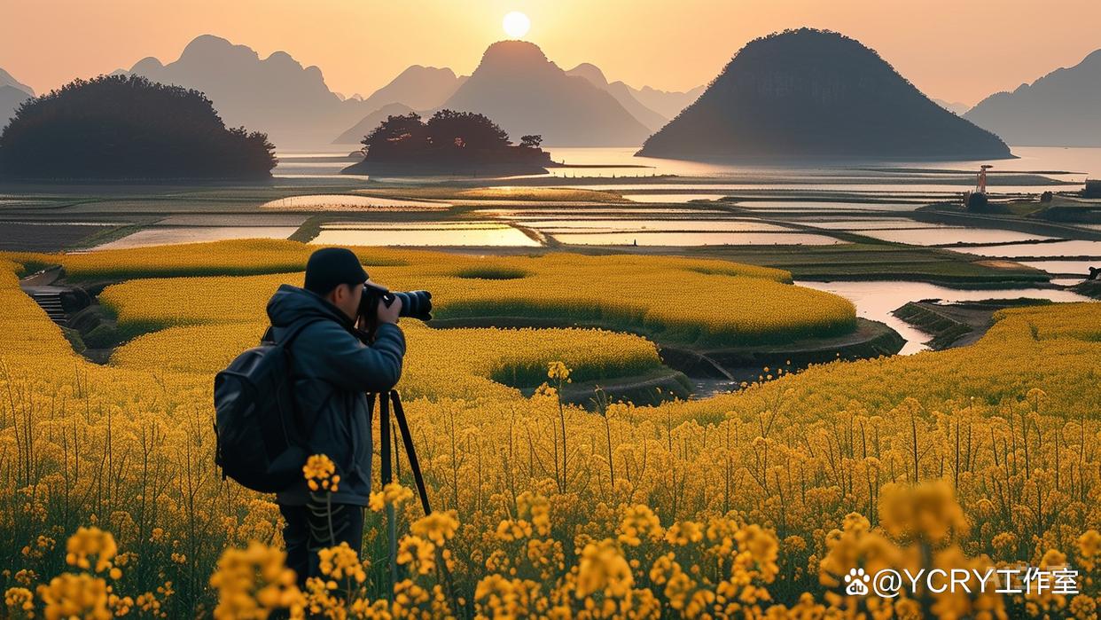 独特景观:千岛式垛田油菜花海,登高俯瞰金色“迷宫”,上午10点前光线柔和,适合摄影创作。