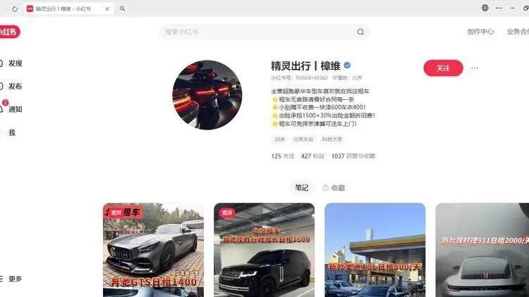去年12月,赵女士计划与朋友租车前往北京滑雪。在小红书平台搜索“租车”后,一个名为“精灵出行丨樟维”的账号引起了她的注意。“对方是有‘蓝V认证’的,介绍里还写着‘线上排名第一的租车平台’,我当时觉得,有平台认证肯定靠谱。”