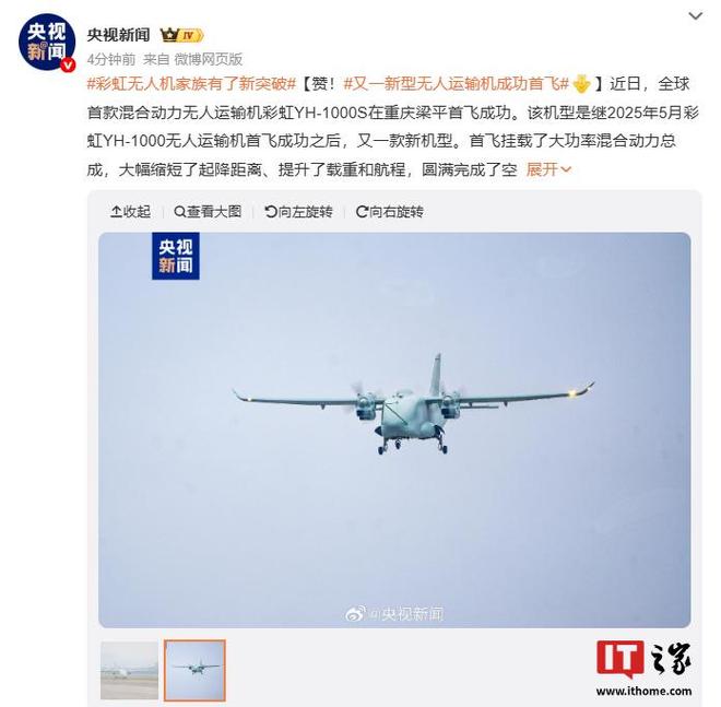 IT之家 2 月 3 日消息,据央视新闻今日报道,全球首款混合动力无人运输机彩虹 YH-1000S 近日在重庆梁平首飞成功。该机型是继 2025 年 5 月彩虹 YH-1000 无人运输机首飞成功之后,又一款新机型。
