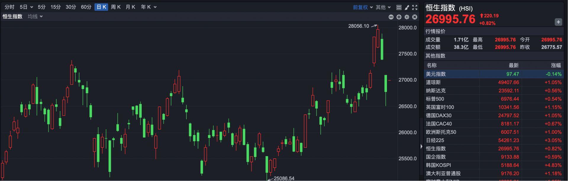 截至发稿,恒生指数开盘报26995.76点,上涨220.19点,涨幅0.82%。
