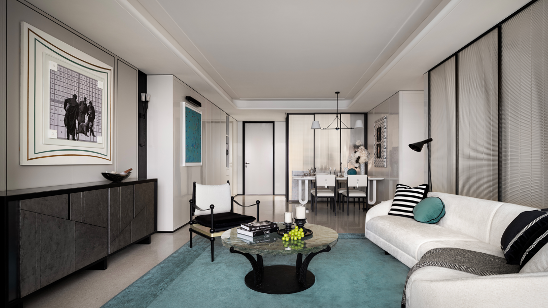 宽境阳台、客餐一体,全域贯通配合香奈儿高奢风,呈现超大尺度家庭公共空间;
