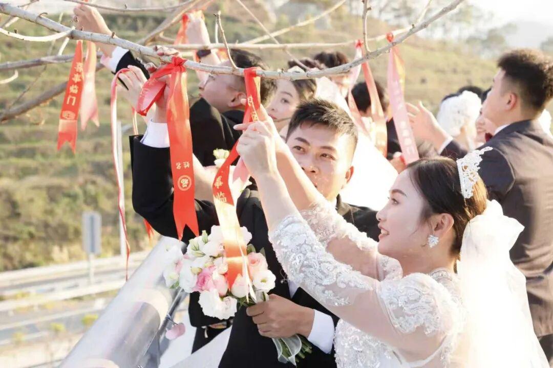 集体婚礼现场十对新人交换戒指、许下誓言,证婚人现场送上祝福,悬挂的爱情锁与许愿带将甜蜜印记永久留存,让交通空间承载起温馨浪漫的情感寓意。