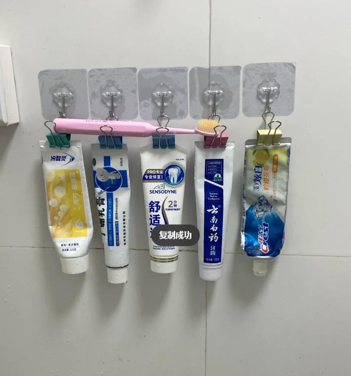 洗护用品,牙刷,牙膏,洗面奶,这些东西用完之后,全部都放在洗手台的台面上,导致台面杂乱不堪,影响美观,也容易滋生细菌,其实我们可以将这些洗护用品全都挂起来,