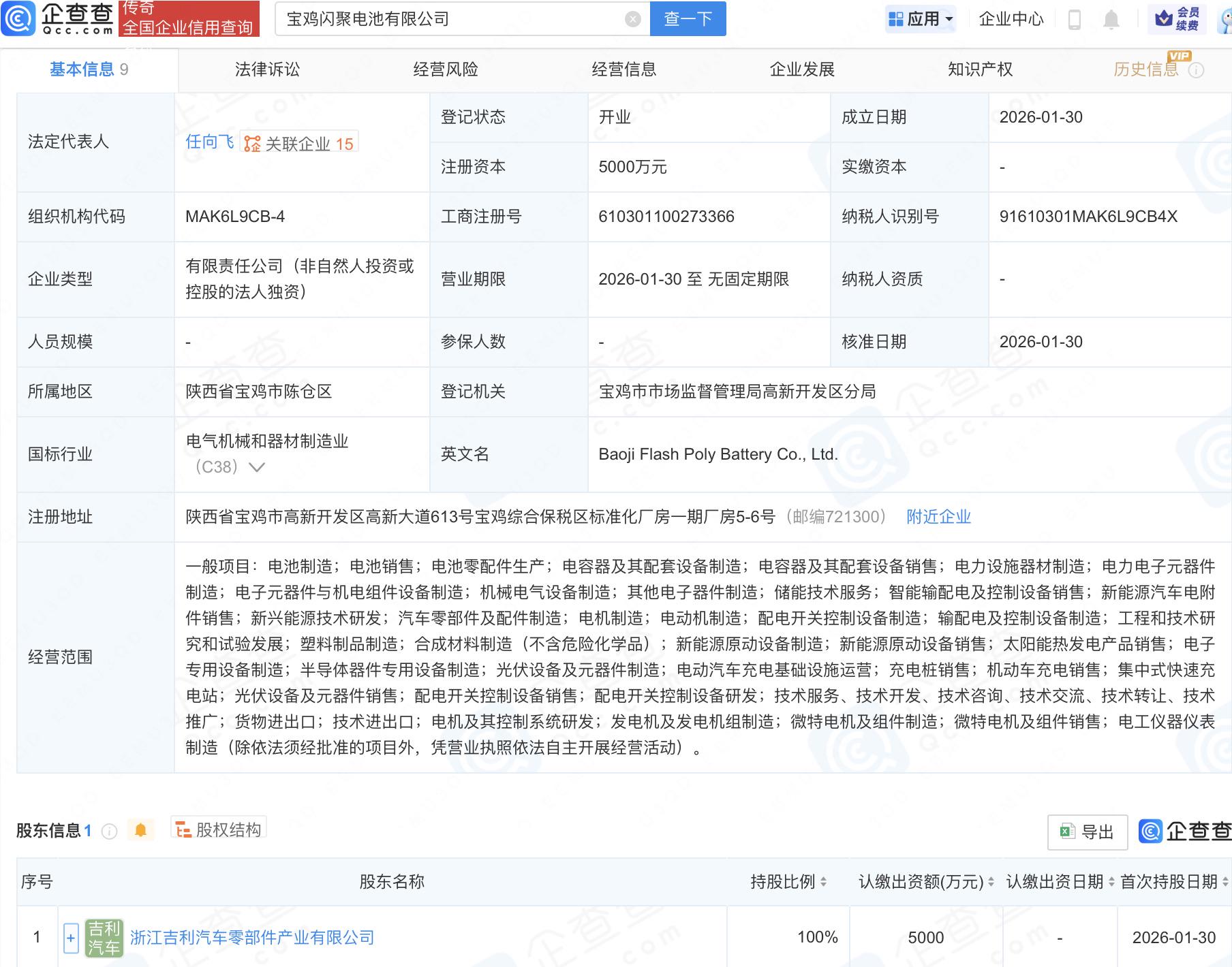 企查查APP显示,近日,宝鸡闪聚电池有限公司成立,法定代表人为任向飞,注册资本5000万人民币,经营范围包括电池制造、电池销售、电池零配件生产、电容器及其配套设备制造等。企查查股权穿透显示,该公司由浙江吉利汽车零部件产业有限公司全资持股。