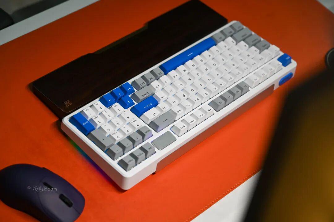至于影响颜值的要素,另外就是键帽、键盘的配色了,这一点我个人觉得是键盘给人的第一视觉要素。我的这一把是「幻影机甲」的白灰蓝配色,我还挺喜欢的,属于稳重之余又有点活泼的风格。不知大家会选哪种配色,这把键盘有好几种配色也都不错。键帽都是高含量PBT材质,指尖触感不错。