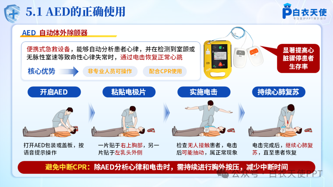 1/取来 AED 后立即开机,严格遵循语音提示操作(所有官方 AED 均配备全程语音指导);