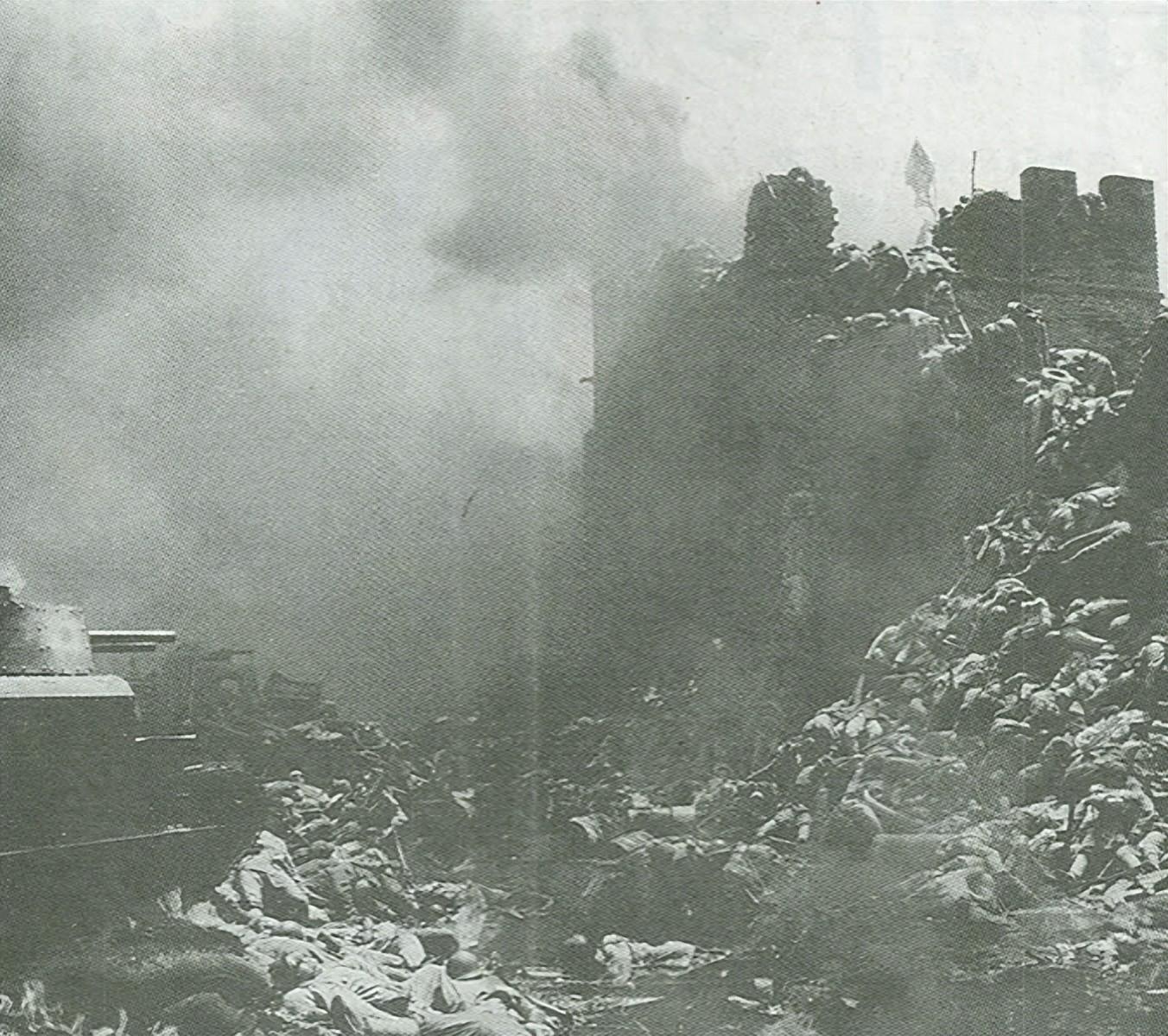 中国军人退到了街巷里,退到一段段破墙后面,房子塌下去,他们就从砖瓦缝里钻出来再打一枪,有的人最后一颗手榴弹,是抱着敌人一起炸的。