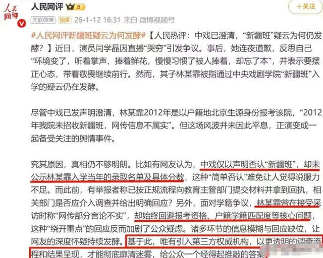 没想到因为哭穷被官媒点名、全网账号禁关、各大品牌解约之后,当初儿子林傲霏陷入争议的中戏新疆班事件,如今又有号称被顶替考生出来发声。