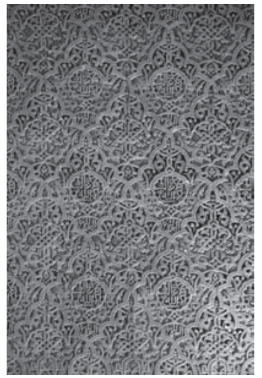 正如德蒙泰坎(1987: 162)所指出的,至8世纪末期,某些美学法则与规范已初步确立。这些法则融合了古代地中海与中世纪欧洲的传统,并与丰富的波斯遗产相结合。其装饰母题与纹样主要分为三类:植物纹、几何纹与书法纹。德蒙泰坎(1987: 162)特别指出了一种在科尔多瓦及其他地区特色建筑中占据主导地位的装饰类型——一种植物藤蔓状阿拉伯纹饰(德蒙泰坎称之为“茛苕纹饰”),常与几何纹、书法纹或其组合图案结合使用(1987: 162)。他认为,这种茛苕纹饰是视觉艺术发展的产物,其渊源可追溯至亚述棕叶饰,并融合了“古典时期茛苕叶与葡萄叶的植物形态”(1987: 162)。展现此类装饰形式的代表性建筑包括科尔多瓦大清真寺(建于786-991年)及被称为扎赫拉宫的宫殿建筑群(936-1010年)。德蒙泰坎进一步指出,该纹饰在11至12世纪于北非地区使用时又有了新的发展(1987: 162)。