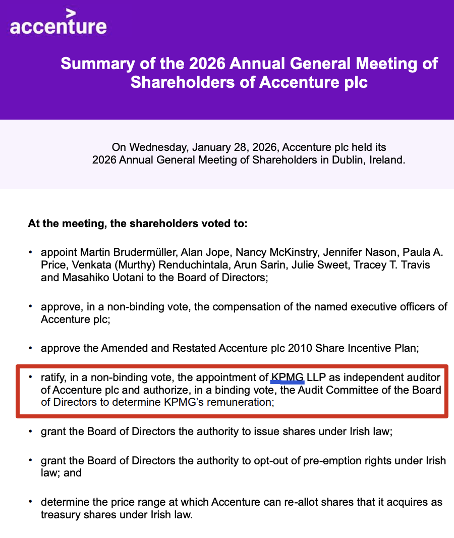 2026年1月28日,埃森哲股东已通过决议,继续聘任毕马威会计师事务所担任公司的独立审计师。