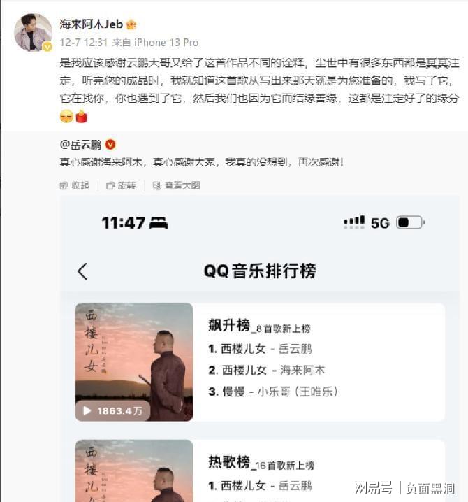 凭借翻唱海来阿木的《西楼儿女》,岳云鹏一度登顶QQ音乐榜单,并且还称霸了流行榜、热歌榜的榜首。