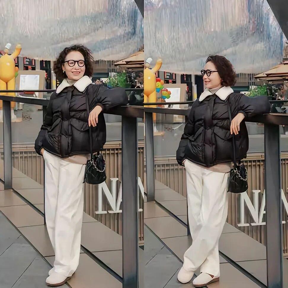 下半身偏胖、胯宽腿粗的中年女性,就选上宽下窄,上身穿宽松羽绒服、大衣,下装搭配紧身打底裤、烟管裤,轻松摆脱臃肿感。