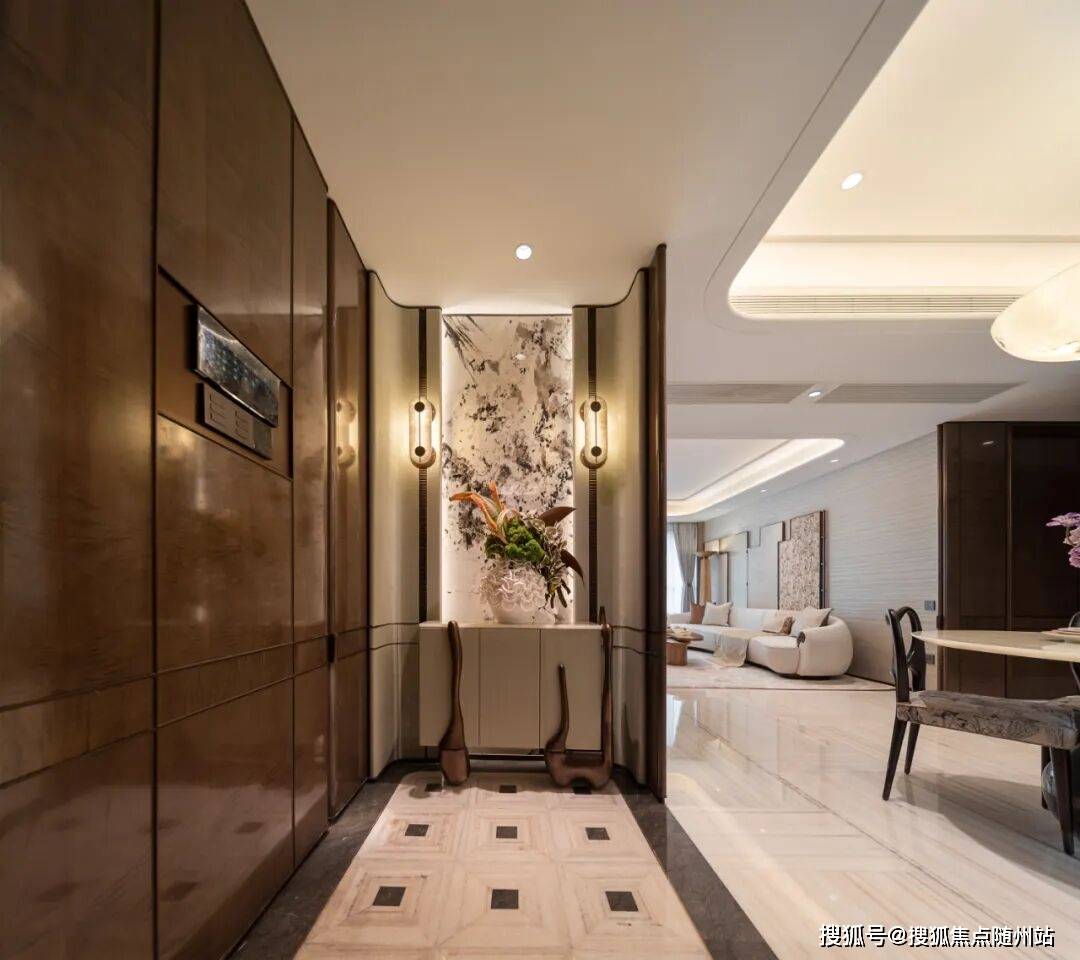 选用天然木饰面、金属线条与暖灰色调,材质之间形成细腻对比。香槟金细节从建筑立面延伸至室内,形成视觉与情绪的统一。