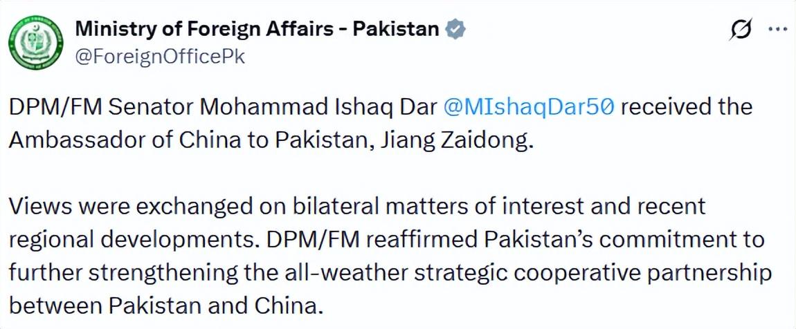出了这么严重的事情,巴基斯坦自然要向自己的全天候战略合作伙伴中国通报情况。根据巴外交部的说法,该国副总理兼外长达尔已经与中国驻巴基斯坦大使见面。双方就共同关心的双边问题和近期地区局势交换了意见。