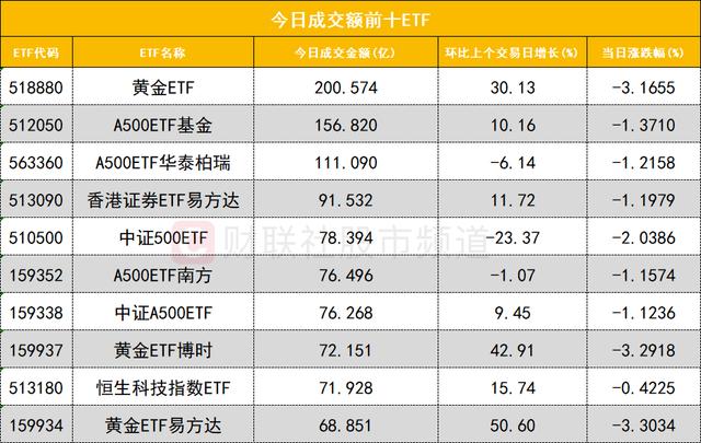 从成交额前十的ETF来看,黄金ETF(518880)成交额位居首位,A500ETF基金(512050)成交额位居次席。