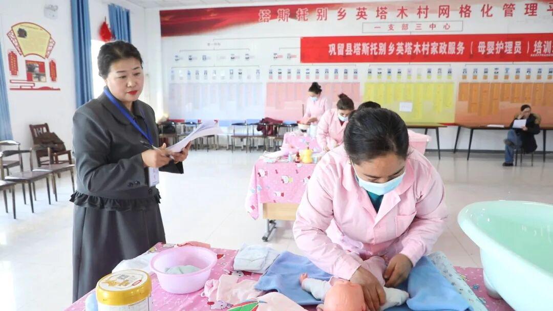 另一边,塔斯托别乡英塔木村的母婴护理培训结业考试也在有序进行。考试紧扣母婴家政服务核心需求设置内容,采用“理论+实操”的考核模式,涵盖新生儿喂养技巧、日常护理要点、产妇产后照护、婴幼儿沐浴流程及常见婴幼儿疾病预防等关键知识点。培训现场配备了模拟娃娃、婴儿衣物等专业器具,参考学员分组动手模拟操作,细致演示母婴护理环节,展现培训成效。