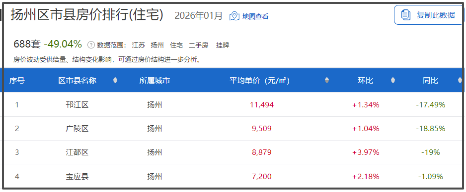 近一月扬州二手房均价9997元/㎡,挂牌均价最高的是邗江区为11494元/㎡,新增房源688套。