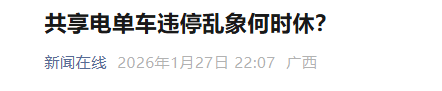 1月27日广西新闻频道《新闻在线》栏目曝光了广西南宁、桂林等地存在的共享电动车违停乱象。其中,桂林七星建干路、七星万达、叠彩万达周边路段均存在市民将共享电动车乱停乱放现象。