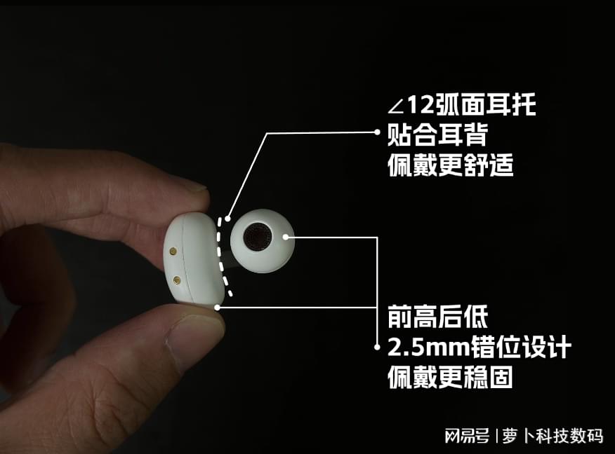 这款虹觅小云夹在佩戴设计上很独特,耳机做了2.5mm前高后低的错位设计,能顺着耳道的自然结构贴紧,不会晃来晃去,非常稳固。加上电池仓的12°弧面耳托设计,能刚好托住耳背,把重量分散开,久戴也不压得慌。最关键是轻,单只才4.5g,戴在耳朵上几乎没感觉,哪怕连续戴三四个小时,也不会有夹耳感。