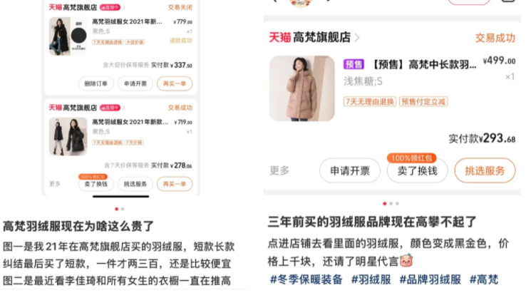 消费者为流量买单,为平替的噱头买单,但有人真正认可高梵的“鹅绒服奢研品牌”定位吗?一旦流量褪去,这场靠营销撑起来的高端化,终究会打回原形。