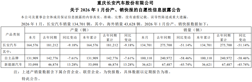 根据披露的产销报告,2026年1月,长安汽车销量134701辆,同比下滑51.14%,同比砍半,即是腰斩。自主品牌方面,1月销量100110辆,同比下滑58.46%,更为严峻;新能源汽车销量36621辆,同比下滑45.74%,也不是一个漂亮的数据。