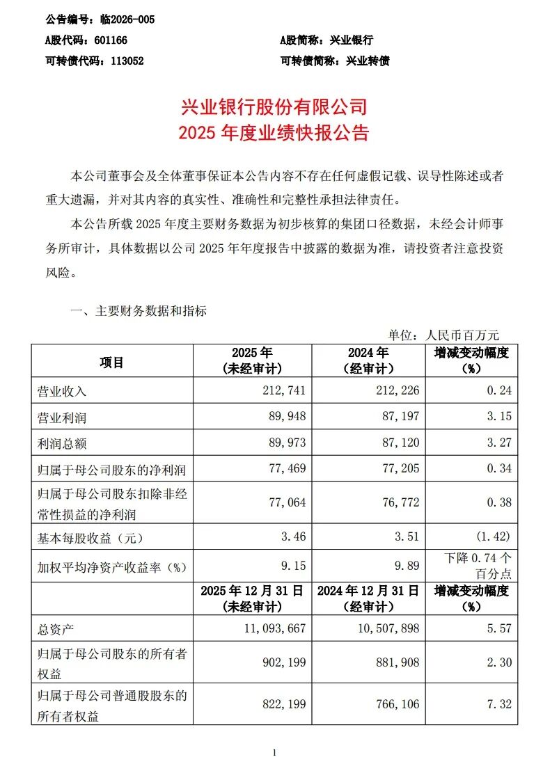 2025年,受行业利差收窄、市场波动等多重因素影响,银行业盈利增速普遍放缓,在此背景下,兴业银行盈利端保持基本稳定,实现了营业收入、净利润的正向增长,展现出较强的盈利韧性,同时也客观面临着盈利增速放缓、收入结构有待优化的压力。年度业绩快报精准显示,全年实现营业收入2127.41亿元,较上年末增加5.10亿元,同比微增0.24%;利润总额899.73亿元,较上年末增加28.33亿元,同比增长3.27%;归属于母公司股东的净利润774.69亿元,较上年末增加2.62亿元,同比增长0.34%;归属于母公司股东扣除非经常性损益的净利润770.64亿元,较上年末增加2.89亿元,同比增长0.38%,核心盈利指标基本稳定,盈利韧性凸显。需要补充的是,净利润增速略低于利润总额增速,主要系所得税费用同比有所增加所致,符合行业普遍情况。