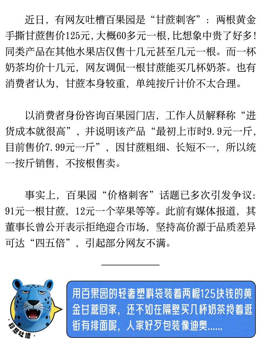 两根甘蔗125元的价格争议,让百果园再次被贴上“甘蔗刺客”标签,消费者直呼“一根能买5杯奶茶”,而其“按斤计价不按根卖”的回应未能平息质疑,百果园所谓的“高端故事”也引发了不小的争议。