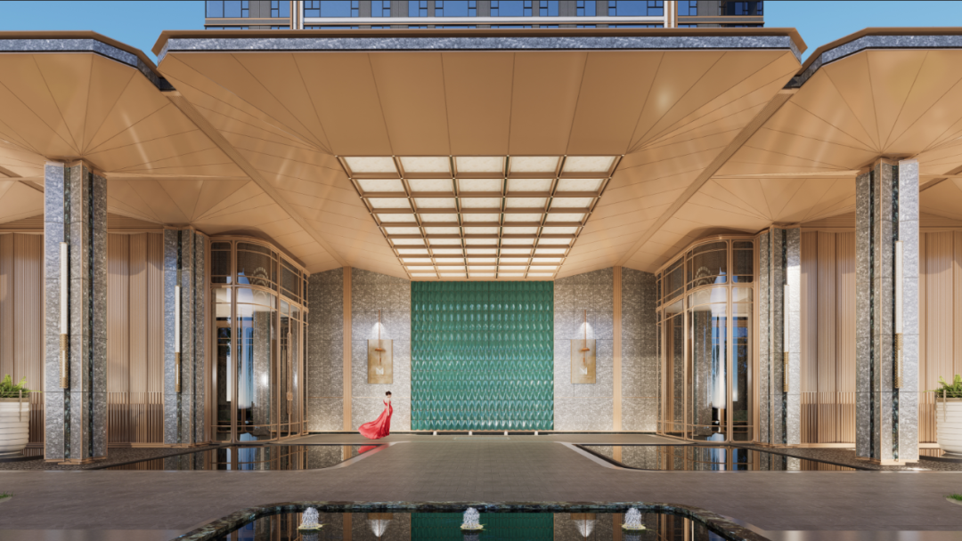 社区门庭顶面采用50片LV同款透光云石打造近100㎡的透光穹顶,顶部采用钻石切割技艺拼贴古铜色蜂窝铝板