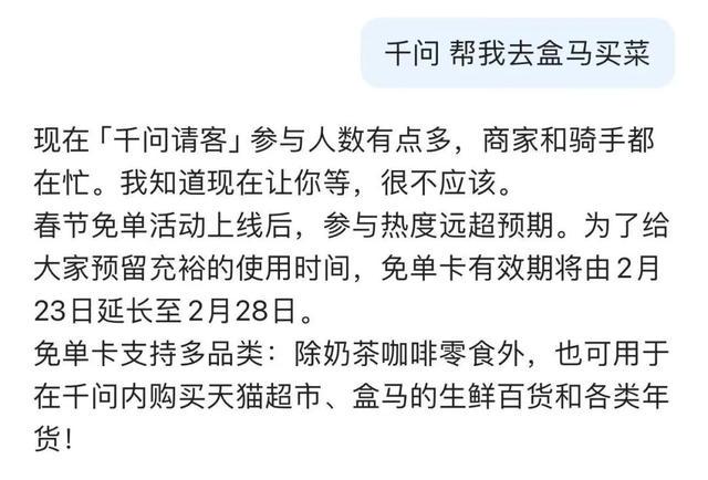 另外,千问APP联合盒马、天猫超市推出“瓜分30亿”春节活动,用户可通过AI指令直接下单买菜、买年货。25元无门槛免单卡可用于生鲜果蔬、粮油零食、礼盒等年货商品,实付低至0.01元。免单卡有效期已延长至2月28日,支持多品类使用。