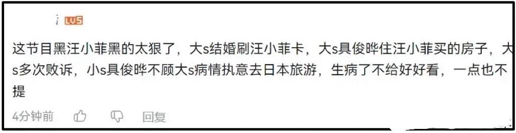 还是有不少清醒的网友,认为这节目黑汪小菲太狠了。大S结婚刷汪小菲卡,住着汪小菲买的房子,和汪小菲的官司还多次败诉,似乎都被忘记了。