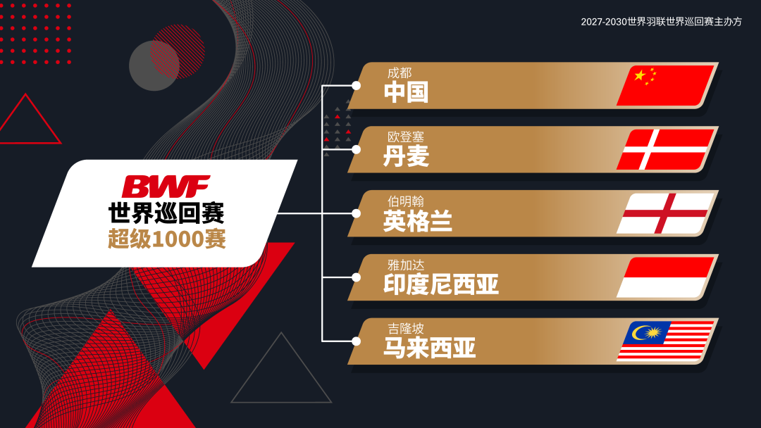 2027-2030周期,世界巡回赛每年设置1站总决赛,5站1000赛,5站750赛,9站500赛,8站300赛,以及暂定的8站100赛。与目前对比,下周期的1000赛在中国、全英、印尼、马来西亚的基础上增加一站,由原来750级别的丹麦站升级而成。750赛因丹麦站升级而减少1站,且有升降变化:中国、法国、印度、日本这4站保持不变,新加坡公开赛从750降为500级别,中国香港公开赛从500升为750级别。此外,500赛数量不变,仍为9站;300赛减少至8站;总决赛承办地将另行征集。