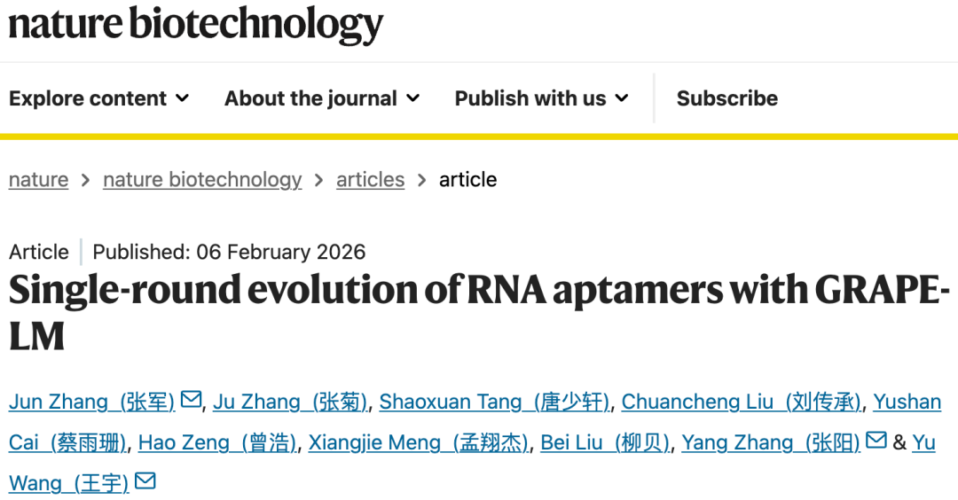 6. J. Zhang, J. Zhang, S. X. Tang, C. C. Liu, Y. S. Cai, H. Zeng, X. J. Meng, B. Liu, Y. Zhang, Y. Wang, Single-round evolution of RNA aptamers with GRAPE-LM. Nat Biotechnol, (2026). doi: 10.1038/s41587-026-03007-5
