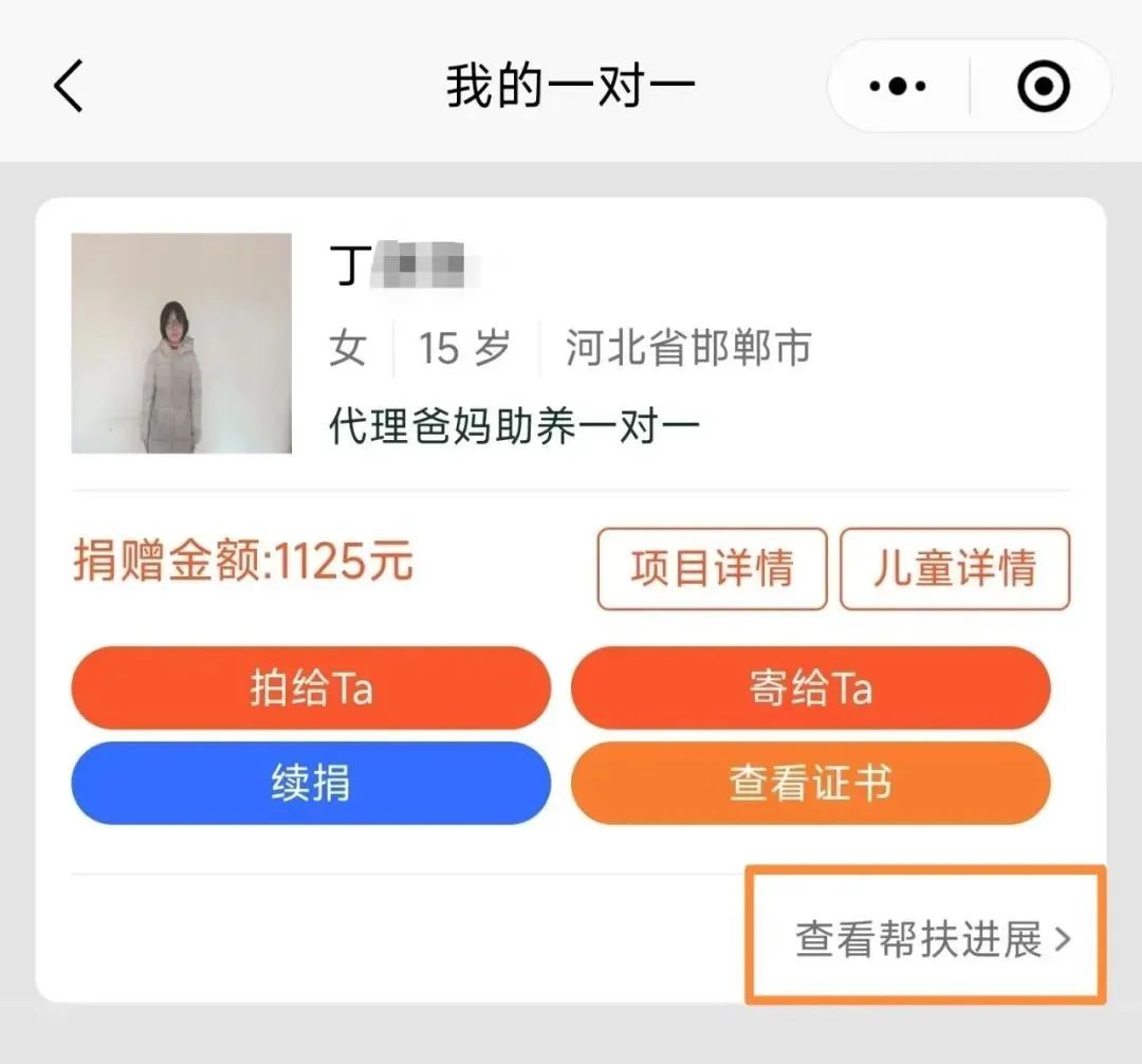 04.点击“我的一对一”,看到您捐赠孩子的具体进展反馈