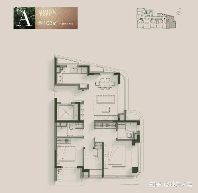 结合这张建面约 103㎡的边套A户型来看,整个户型用了罕见的“三边采光”设计,主卧270°环幕,让观景角度更广,用阔绰边厅+景观大飘窗的方案,完成对城心稀缺景观资源的极致占有。