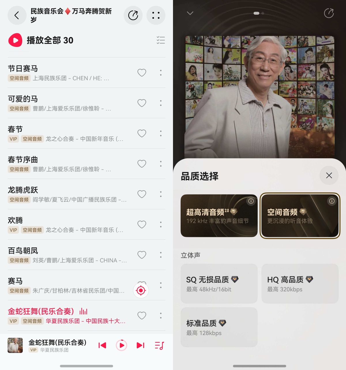 相比之下,鸿蒙6华为音乐的音质也有“一耳朵提升”。歌单里所有歌下面都带着“超高清音频”和“空间音频”的小角标,点击就能开启相应的品质,可以根据不同的歌或者喜好选择不同的音效。比如,听“民族音乐会-万马奔腾贺新岁”歌单中《金蛇狂舞》这种大场面民乐合奏的时候,我就喜欢连上我的FreeBuds Pro 5悦彰耳机,打开空间音频来听。听感一下子就大不相同,声音不是单纯地从左右耳传来,而是有种被音乐包裹在中间的感觉,这种沉浸感,在候车室、高铁上这类嘈杂环境里听特别合适,一整个车程我都非常舒适。