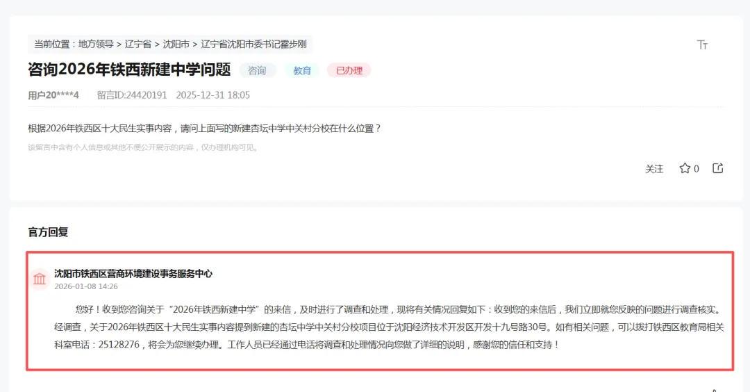 官方回复称:关于2026年铁西区十大民生实事内容提到新建的杏坛中学中关村分校项目位于沈阳经济技术开发区开发十九号路30号。