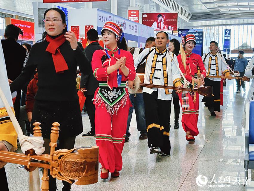 旅客与演员们在昆明南站的候车大厅内跳起欢快的彝族三弦。人民网记者 刘怡摄