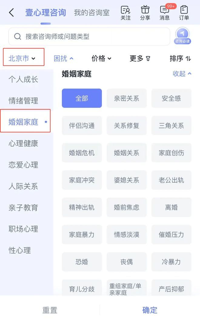 下载登录壹心理App,进入壹心理咨询页面,选择您所在的城市,以北京为例,选择“婚姻家庭”,即可出现您想咨询的问题,列表将为您推荐适合您需求的咨询师为您服务。