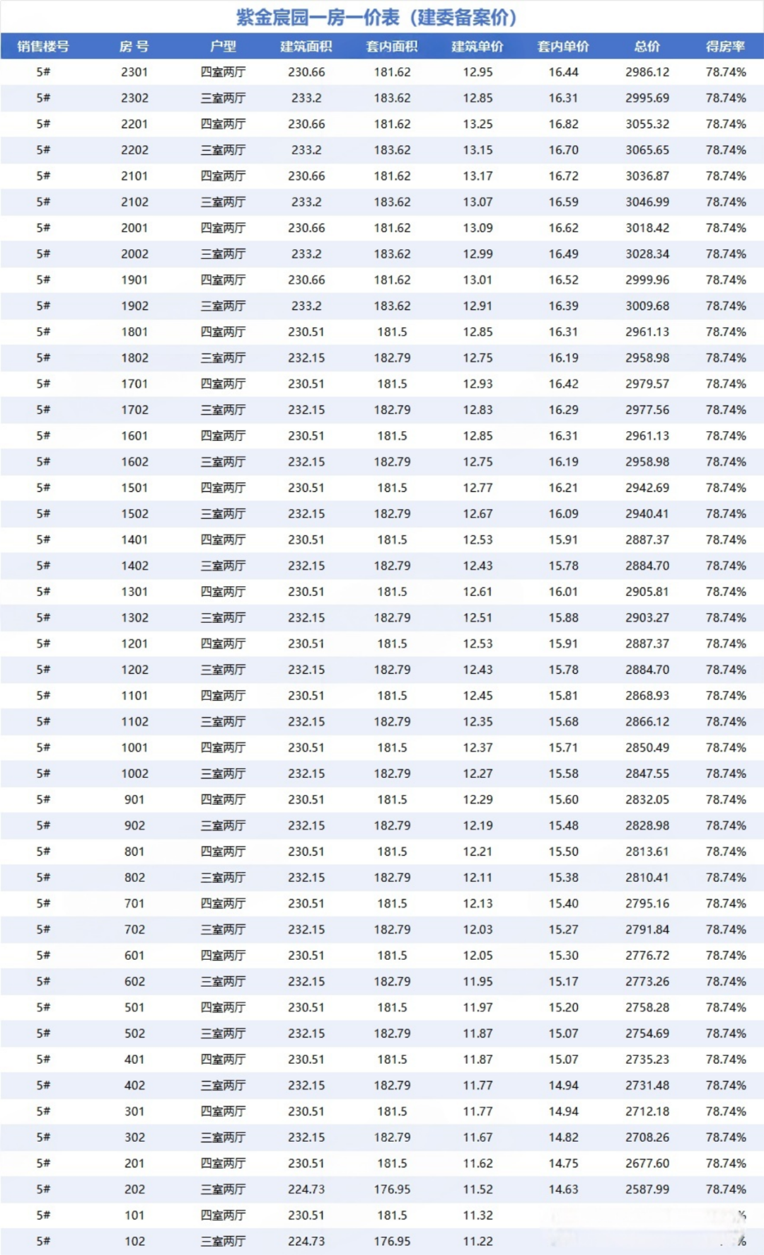 紫京宸园5号楼一房一价表