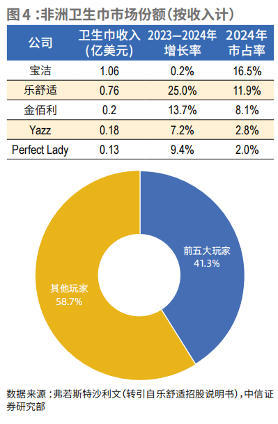 据弗若斯特沙利文的数据,2024年非洲市场婴儿纸尿裤、婴儿拉拉裤、卫生巾市场规模为25.9亿、3.9亿、8.5亿美元,对应2020—2024年的CAGR分别为6.2%、7.2%、8.7%。长期来看,考虑到存量女性人口数量远高于婴幼儿数量,卫生巾成长空间较纸尿裤更大,但现阶段,受限于经济发展水平及女性地位,非洲卫生巾市场规模仅为纸尿裤的1/3。此外,拉拉裤为纸尿裤的消费升级产品,伴随当地消费者收入提升,其增长有望提速。
