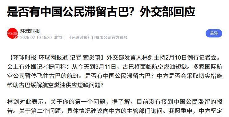 中国外交部回应掷地有声:“目前暂未接到古巴境内有中国公民滞留的报告。”